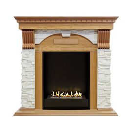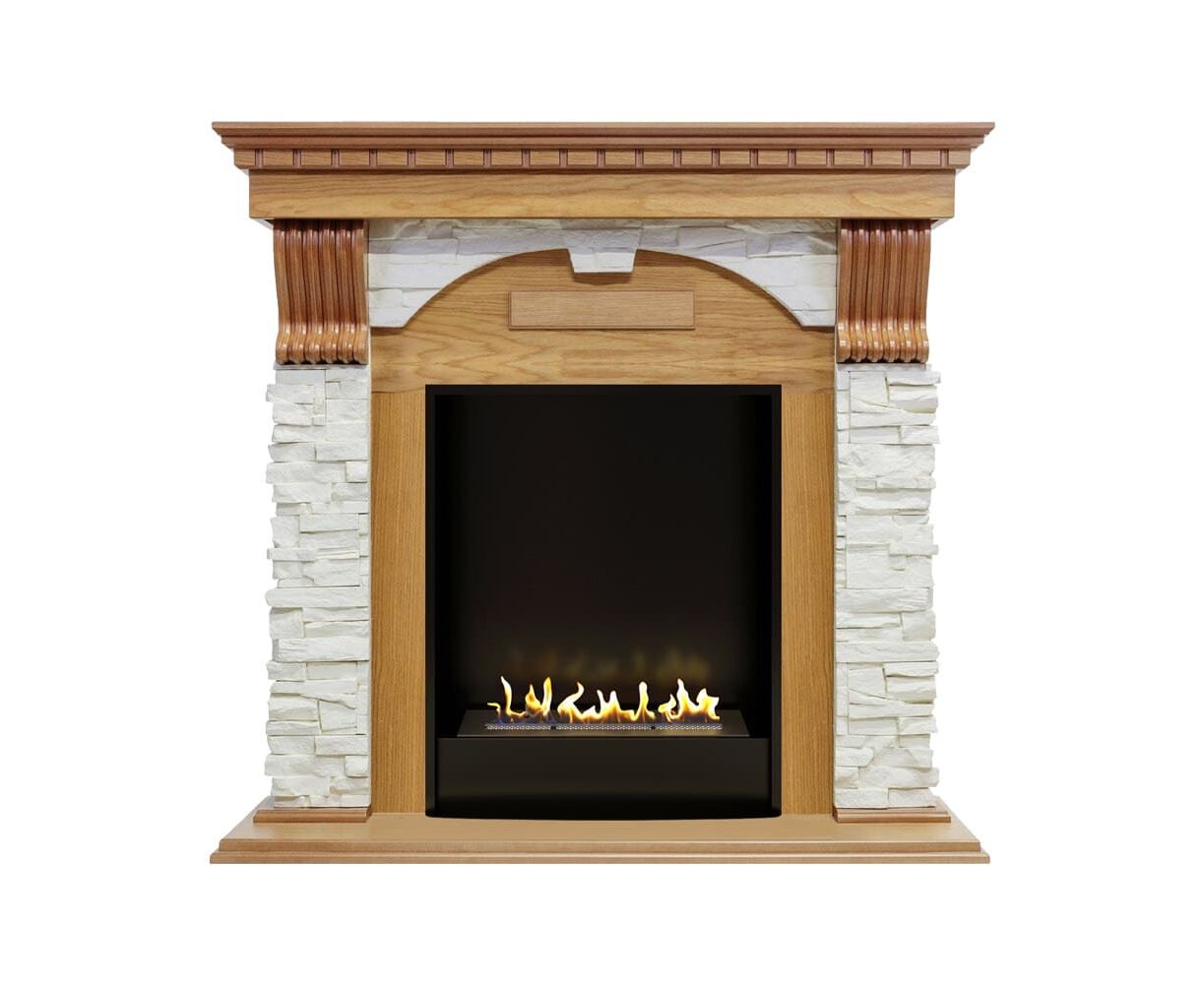 Портал Dublin выполнен в классическом стиле с античными элементами. Боковые колонны из светлого камня, стилизованного под натуральную сланцевую породу, дополнены резными узорами контрастного цвета. Столешница и постамент выполнены из дерева. Такое сочетание материалов подчеркивает изысканность портала и делает его выгодным приобретением для практических любых интерьеров.