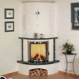 Угловой камин из изразцов светло-кремового цвета. Боковые вставки, столешница и каминная полка зелёного цвета.