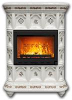 симметричное расположение топки и рельеф изразцов которые прекрасно смотрятся в однотонном исполнении. Изюминкой камина стал цветочный рельеф, украшающий карнизы.