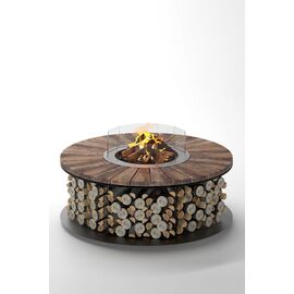 Круглый стол с очагом станет самым главным элементом садовой мебели на участке, террасе, патио, беседке. Столик может быть выполнен со столешницей из раных материалов -это может быть камень, металл или дерево как на фото. Особенностью этой модели является ,то что топливом здесь служат дрова, а не газ.