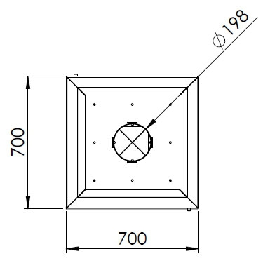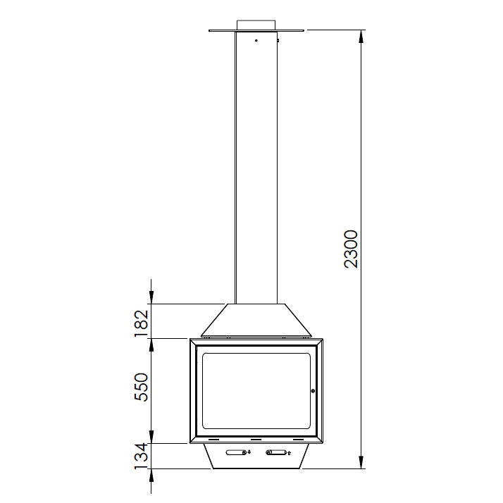 Центральный подвесной камин со стеклом и двойным верхним кожухом. Цвет - черный. Дымоход: Ø198 мм