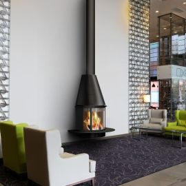 Фронтальный подвесной полукруглый камин с полукруглыми стеклами.