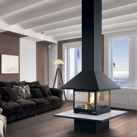 Классический центральный камин, простой в установке и безопасный в эксплуатации. Со стеклом, цвет камина - черный. Полка с отделениями под укладку мрамора. Мрамор заказывается отдельно (опция). Мощность: 10 кВт