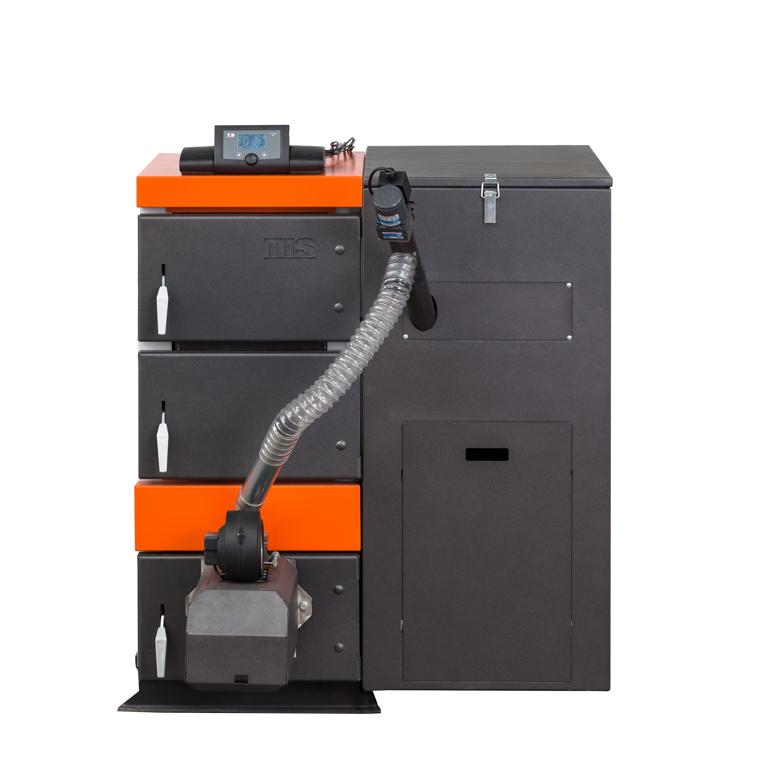 Котел комплектуется бункером, подающим шнеком, надежным экономичным редуктором, современной системой защиты от возгорания топлива и погодозависимой автоматикой TIS-tronic 496p (аналогичная автоматика установлена на котлах TIS DUO pellet (TISNew DUO PELLET), цена на такие котлы оправдывается коэффициентом полезного действия), режим работы которой позволяет программировать процесс горения в зависимости от условий эксплуатации, погоды и качества топлива. Топливо засыпается в большой вместительный бункер, который обеспечивает работу котла от 3-х до 7-ми суток.