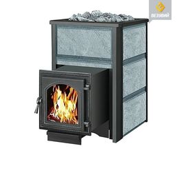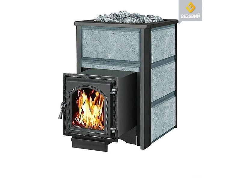 Преимущество печи в том, что топка печи состоит из 3-х ЧУГУННЫХ элементов. На стыке между ними используется керамический шнур с рабочей температурой 1200 градусов. То есть топка печи абсолютно герметична! Для фиксации деталей между собой применяется болтовое соединение, что даёт 100% гарантию безопасности при эксплуатации. Конвекционно–вентилируемая облицовка, изготовленная из экологически чистой горной породы , который обладает большой теплоёмкостью, что позволяет камню в короткие сроки нагреваться и максимально долго удерживать стабильную температуру в парильном помещении, а также гасить жёсткое инфракрасное излучение Камень обладает исключительными лечебными свойствами: помогает при головных болях, при нестабильном артериальном давлении, при простудных заболеваниях, воспалительных процессах в почках и пищеварительной системе, снимает повышенную возбудимость и нервозность, сглаживает эмоциональные всплески. Облицовка из натурального камня при нагреве способна аккумулировать тепло, что гарантирует максимально равномерный прогрев и сохранение тепла Банная печь ЛЕГЕНДА 22 270 укомплектована чугунной каминной, самоохлаждаемой дверцей Везувий 270 с большим жаропрочным стеклом «SCHOTT ROBAX», с оборудованной системой самоочистки, что позволяет визуально контролировать горение и любоваться видом живого огня. Данная печь рассчитана на объем парильного помещения 12-24 м3.