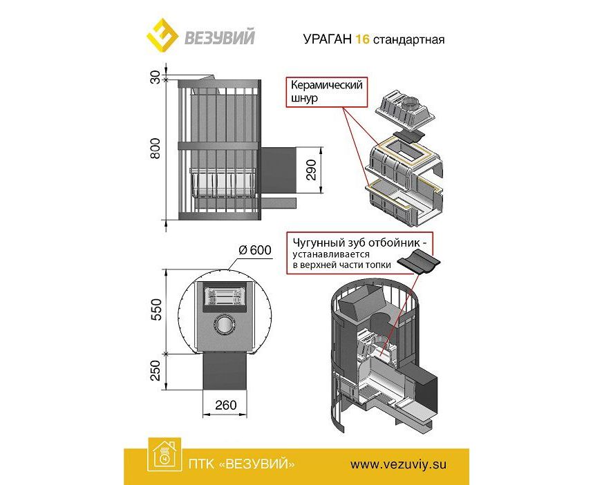 Преимущество печи в том, что она состоит из 3-х элементов. На стыке между ними используется керамический шнур с рабочей температурой 1200 градусов. То есть топка печи абсолютно герметична! Для фиксации деталей между собой применяется болтовое соединение, что даёт 100% гарантию безопасности при эксплуатации.