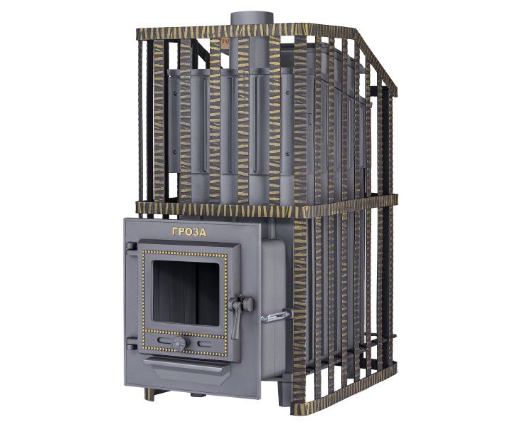 Максимально приближенный вариант печи для режимов русской парной, имеющий непосредственно закрытую чугунным коробом каменку, дверцу для