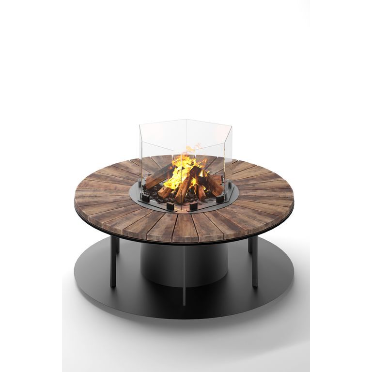 Круглый стол с очагом станет самым главным элементом садовой мебели на участке, террасе, патио, беседке. Столик может быть выполнен со столешницей из раных материалов -это может быть камень, металл или дерево как на фото. Особенностью этой модели является ,то что топливом здесь служат дрова, а не газ.